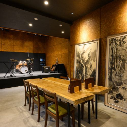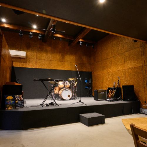 木の温かみ溢れるライブスペース。音響設備が整った本格的なステージには、ドラムセット、キーボード、アンプ、マイクが常備されており、バンド演奏に対応可能です。プロ仕様の機材が、パワフルで臨場感のあるパフォーマンスを強力にサポート。心に響く大迫力の音楽に酔いしれる、エキサイティングな夜をお過ごしください。