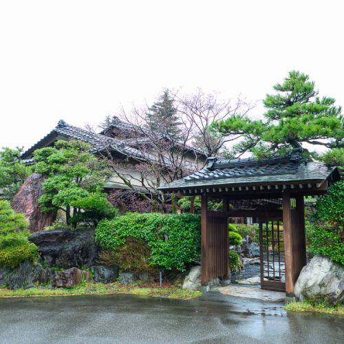 趣のある伝統的な和風建築の外観です。アスファルトの先に、重厚な木造の門が構えられ、奥には風情ある瓦屋根の邸宅が佇んでいます。手入れされた松や、四季の移ろいを感じさせる植栽が美しく、苔むした大岩と相まって洗練された和の空間を創出。訪れる人を穏やかな空気感で迎え入れ、日常を忘れる特別な時間を提供します。