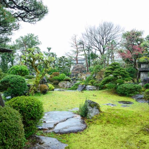 庭に憩いの和を存分に感じられる外観です。手入れの行き届いた松や庭木、苔むした岩肌が織りなす景観は、まさに一幅の絵画のようです。しっとりとした情緒、春の柔らかな新緑、秋の紅葉など、訪れるたびに異なる表情が心を癒やしてくれます。歴史ある和の情緒を感じながら、静寂に包まれる贅沢食事をお楽しみいただけます。